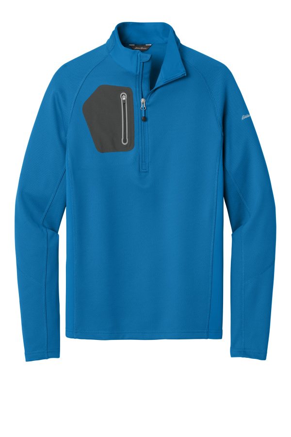 - Welded zippered chest pocket, contrast Eddie Bauer heat transfer logo on left sleeve