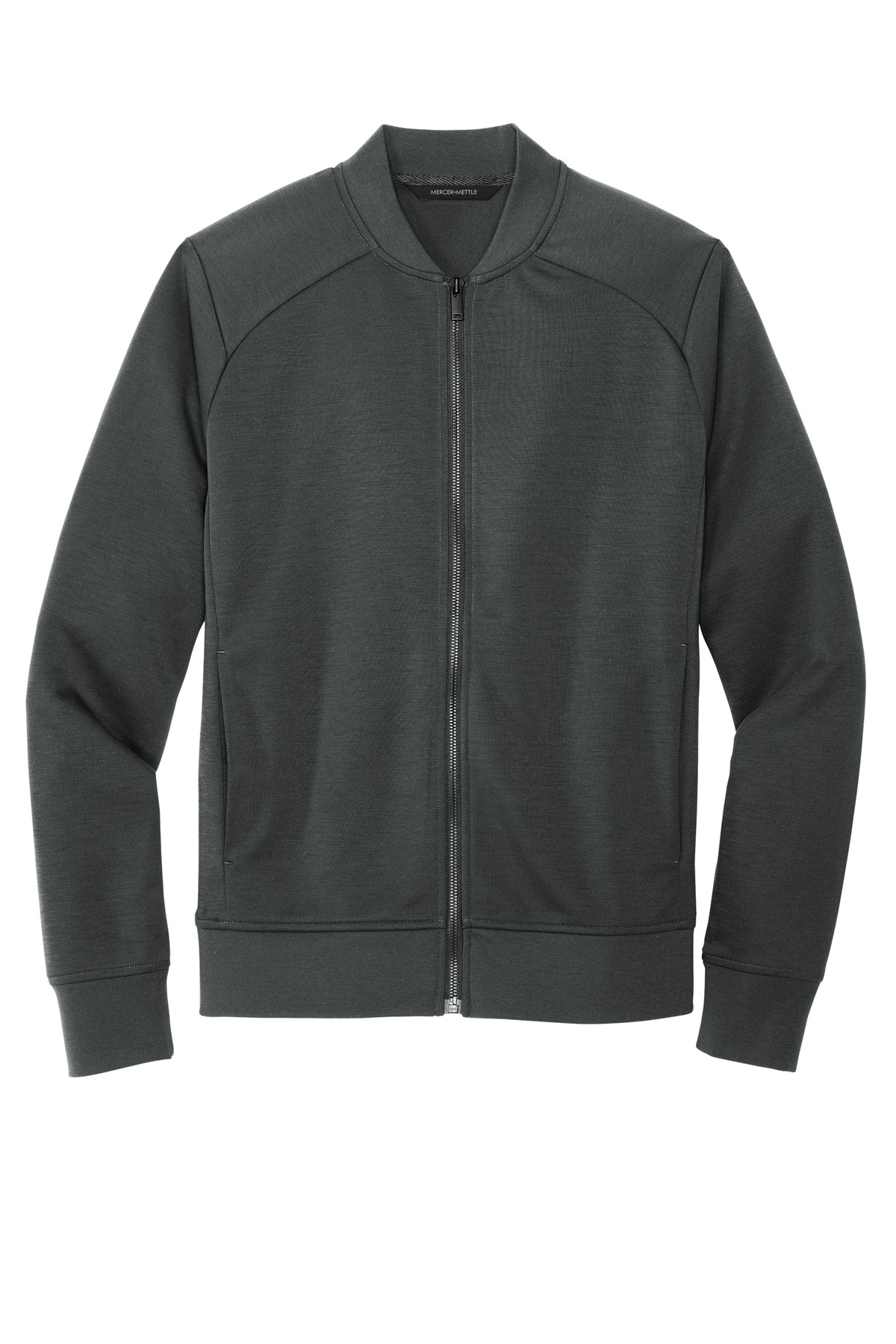 - Exposed zipper with matte black pull